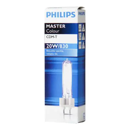 CDM-T are compact discharge lamps. They offer excellent colour stability and a bright light on the basis of the ceramic burner technology used. Philips CDM-T 20W 830 G12 have a G12 base type, which allows them to replace your old halogen lamps without changing your installation. Philips CDM-T 20W 830 G12 lamps have a lifespan of 12000 hours.